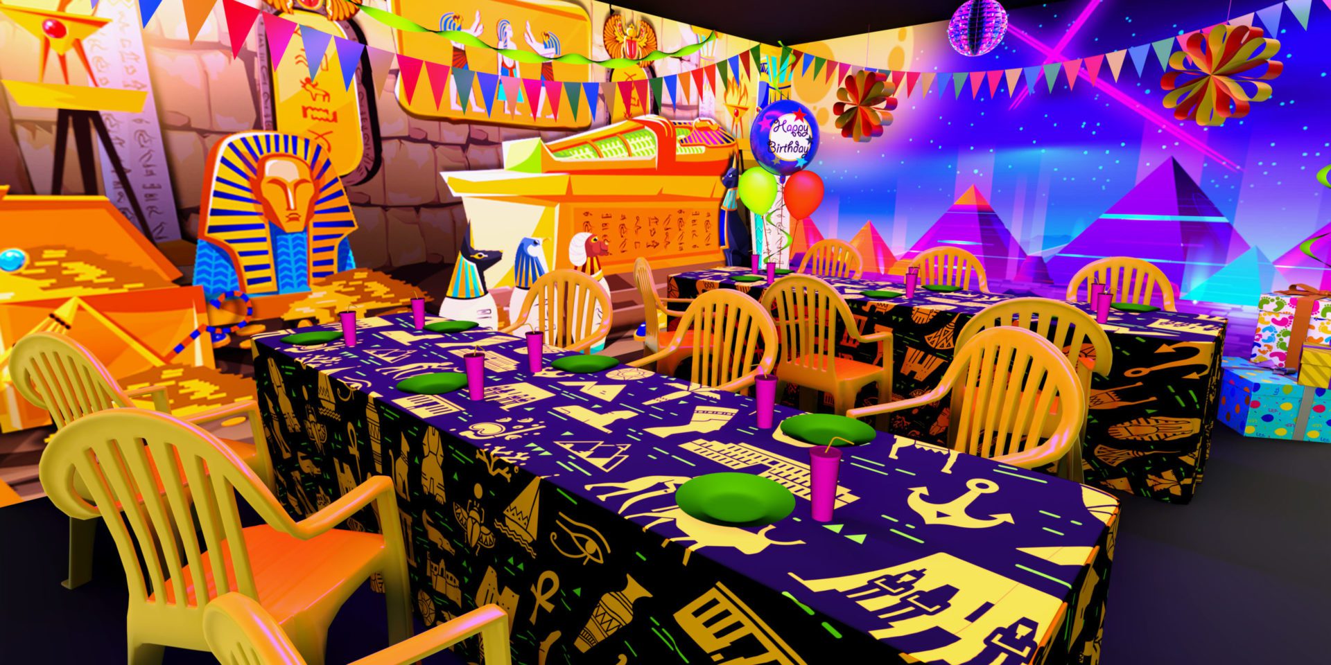 Check out these blacklight party room concepts from our virtual Family Entertainment Center (FEC). We can trial design ideas using a 3D layout of your environment so you know how awesome it will look before we go to print. All we need are the height and length of each wall to get started!